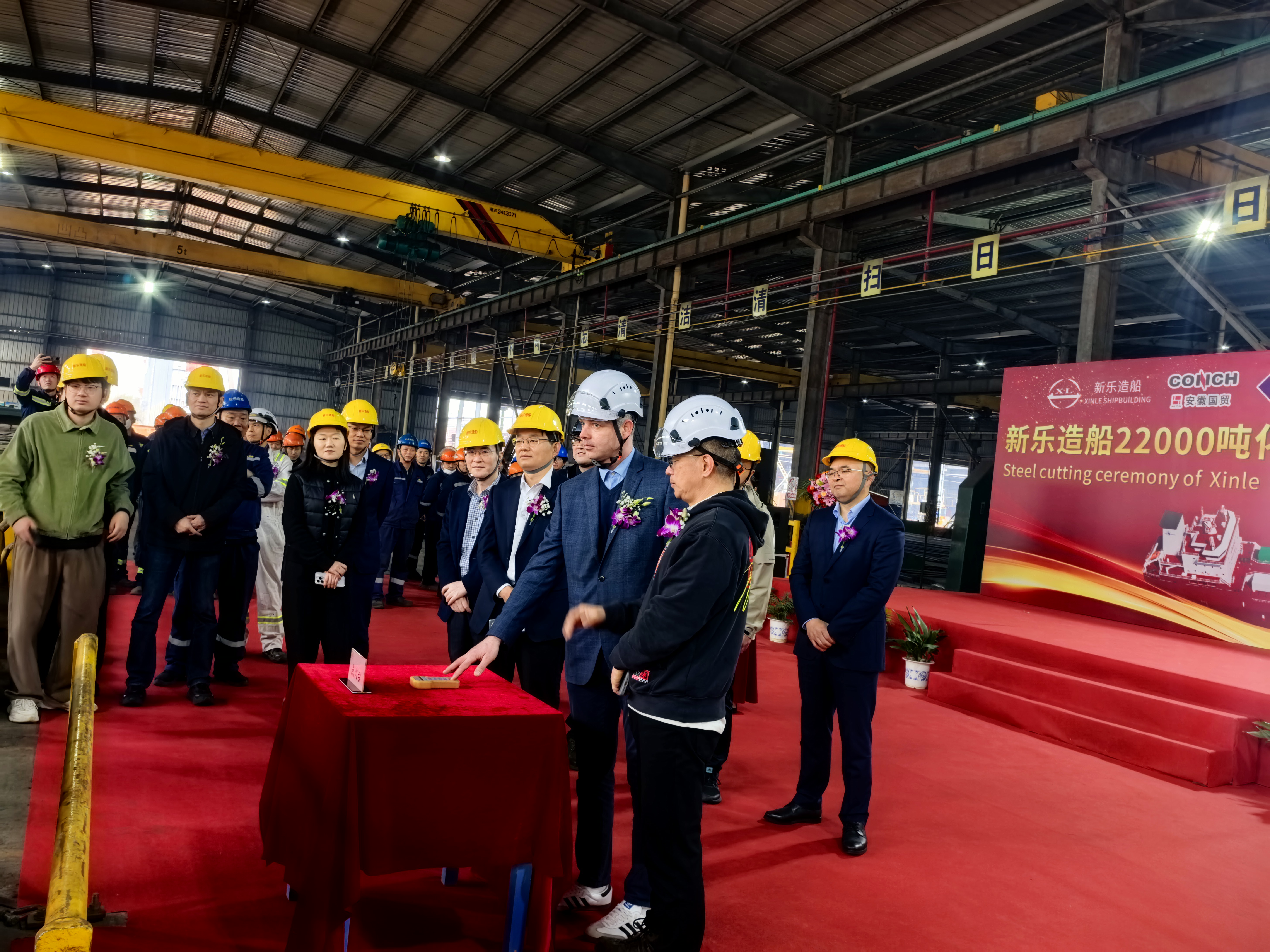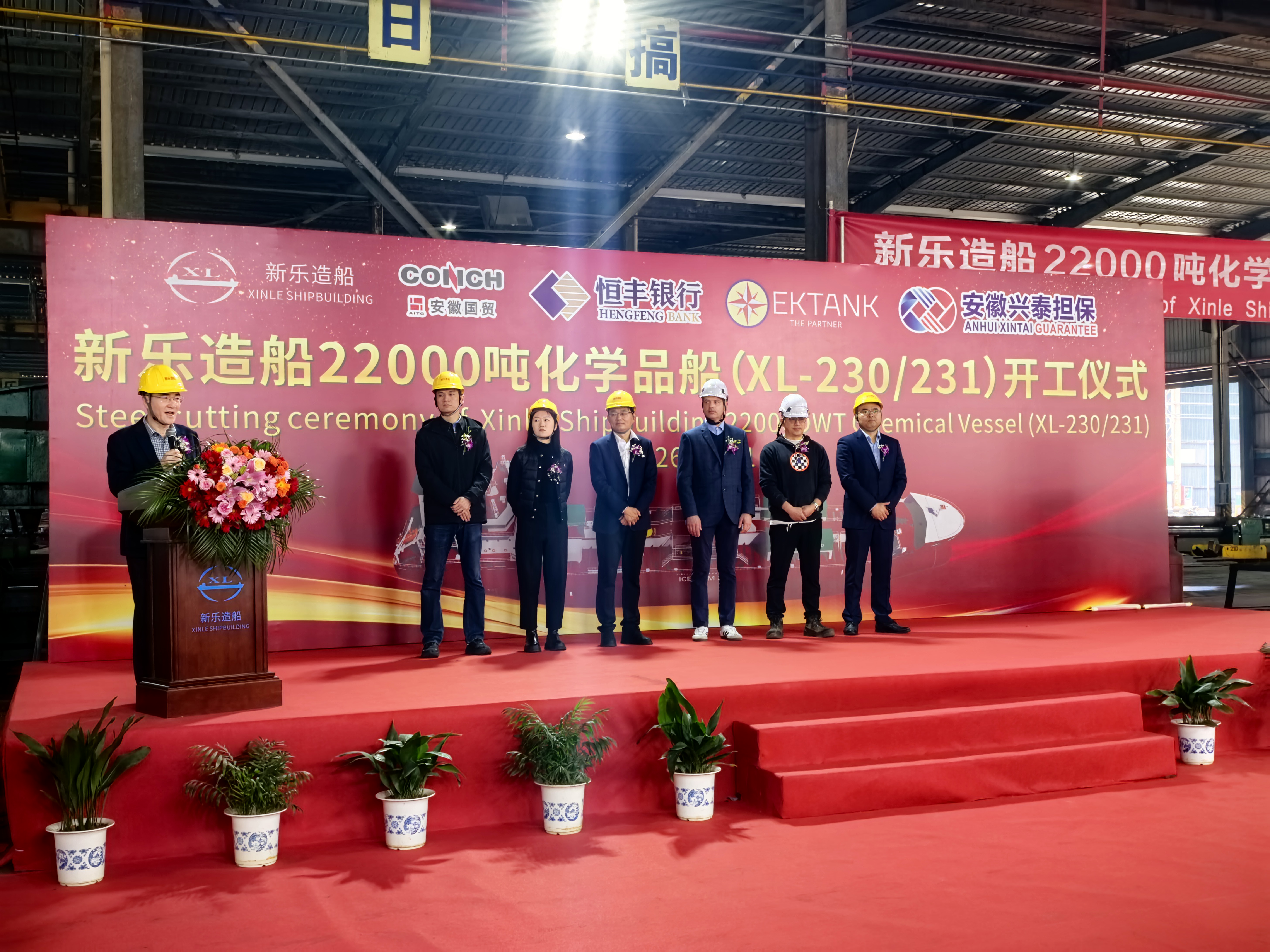 2026年4月1日上午,为欧洲船东建造的22000吨化学品船第二批次船舶开工仪式在新乐造船公司18000平方数控车间隆重举行。船东代表 Popov Evgeny(叶夫根尼 波波夫)先生、船东现场监造代表谭红斌先生、恒丰银行合肥分行交易银行部严卢丰总经理、安徽国贸海畅业务部杨寒总经理、安徽兴泰股权董艳副总经理、美国船级社市场部倪峰总监、浙江新乐造船刘文忠董事长等出席了开工仪式。